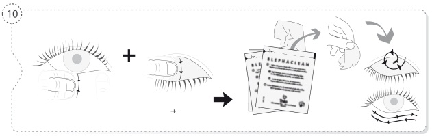 Massaje cuidadosamente as pálpebras com pequenos movimentos circulares, removendo com suavidade quaisquer crostas, películas ou secreções.